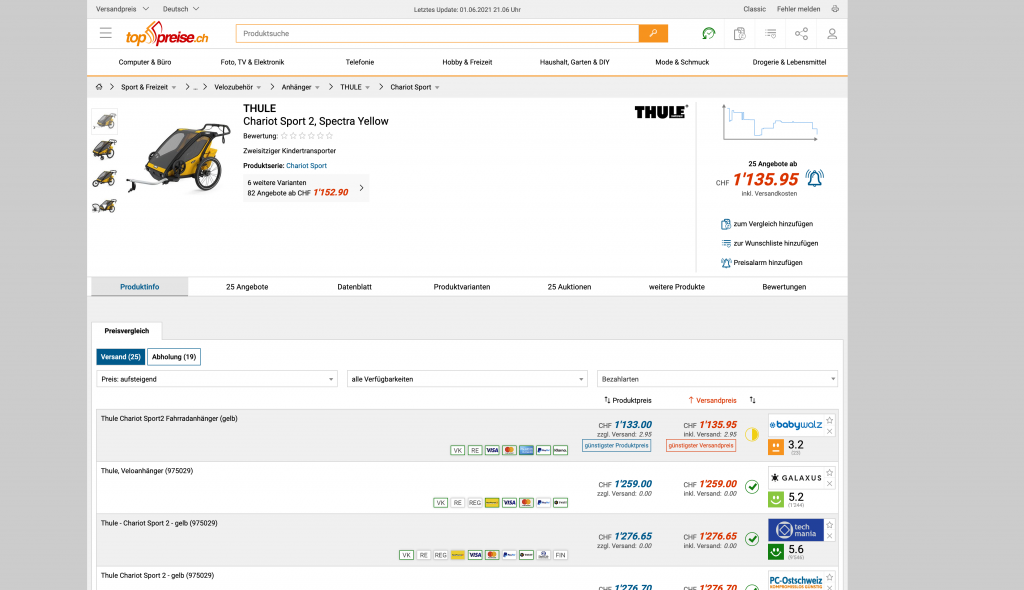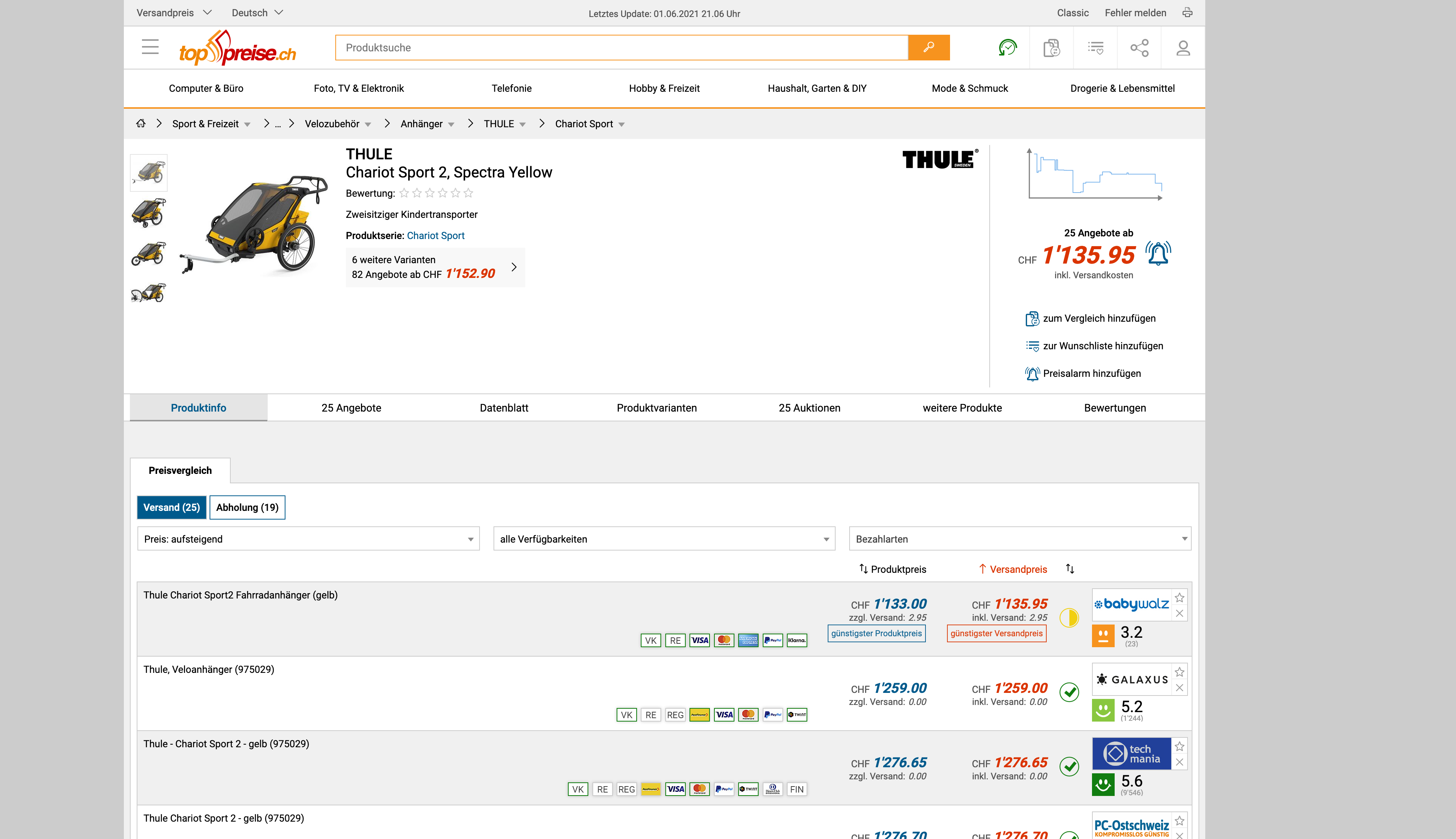 Hatte längere Zeit gewartet und jetzt gibt es den Thule Chariot Sport 2 yellow für CHF 1133.- bei Baby Walz. (Plus CHF 2.95.- Versand)