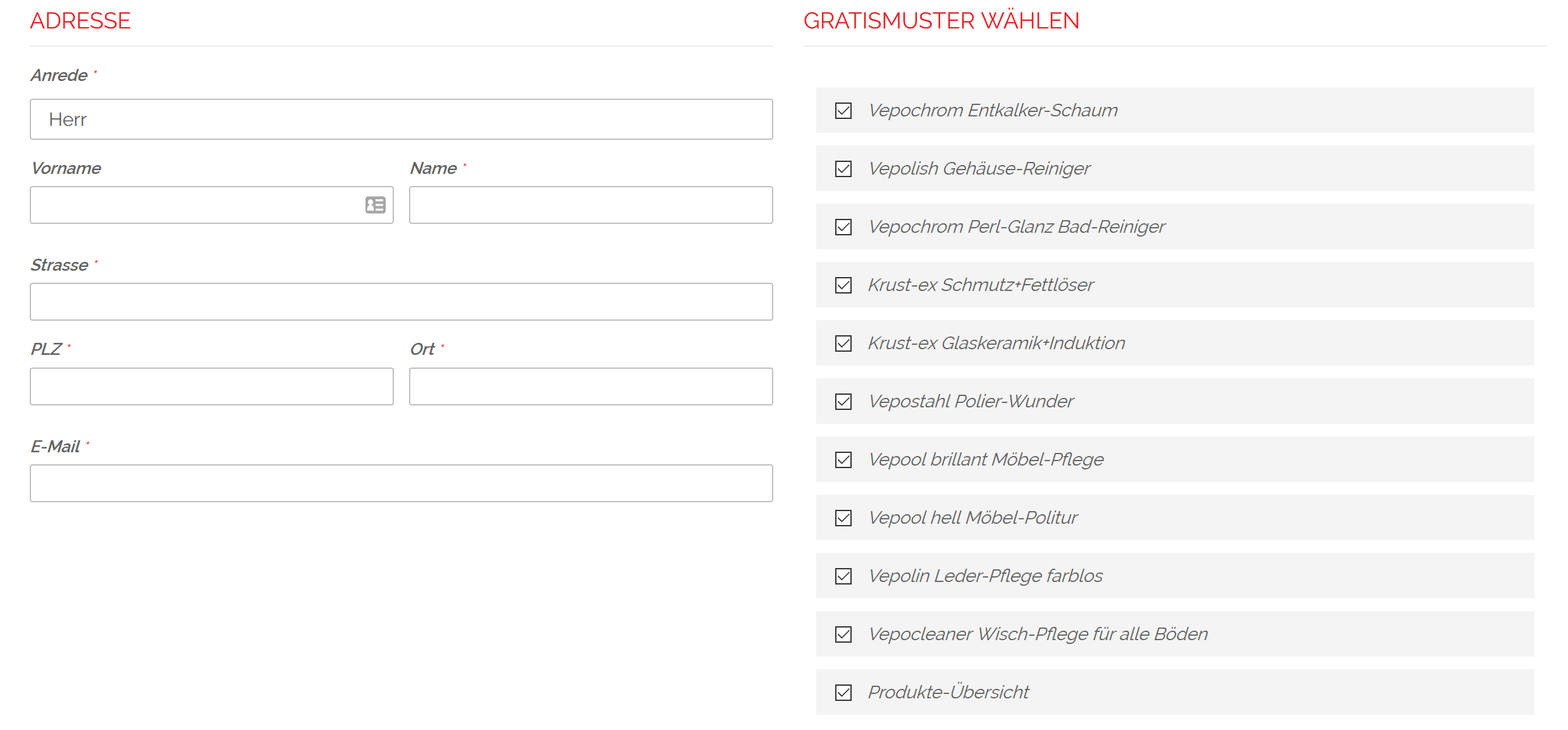 Auf der VEPO-Website finden wir kostenlose Muster Ihrer Reinigungsprodukte. Bis zu 11 Proben können kostenlos auf einen Schlag ausgewählt werden.