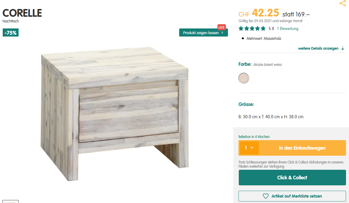 Bis zum 12.04.2021 gibt es bei MICASA bis zu 75 % auf ausgewählte Möbel, Textilien und Wohnaccessoire. Wenn dabei CHF 499.00 zusammen kommen, werden die Lieferkosten von CHF 98.00 geschenkt. Nachfolgend ein paar Beispiele aus dem Ausverkauf: