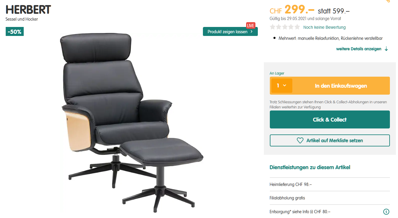 Den Sessel Herbert mit verstellbarer Rückenlehne und Beinauflagehocker (wie man dieses Ding auch immer bezeichnet 😉 ) für CHF 299.00 anstatt CHF 599.00.