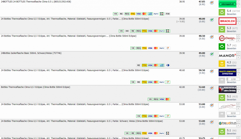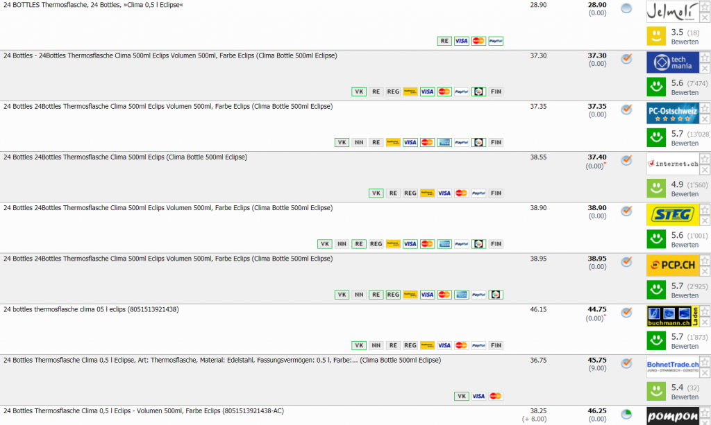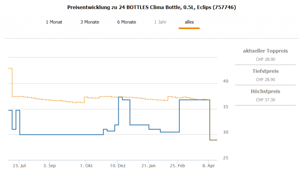 Der Jelmoli Versand hat heute Nachmittag offenbar verschiedene Modelle der beliebten 24 Bottles reduziert. Mit dem Gutscheincode 13176 gibt’s nochmals 20% Rabatt obendrauf. Das Modell „Eclips“ gibt’s damit beispielsweise für CHF 23.10. Zweitbester Preis im Moment: CHF 37.30. Ohne Versand gab es die Thermosflasche schon einmal für knapp 30 Franken, mit Versand war man bisher immer über 35 Franken.