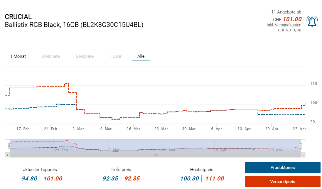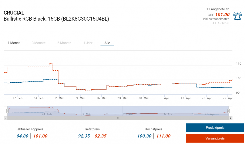 Im Deallink ist die schwarze 3000Mhz-Variante verlinkt, Bestpreis laut toppreise lag in der Vergangenheit bei CHF 92.35. Der Artikel wird allerdings erst in einer Woche versandt.