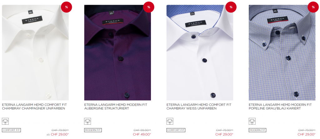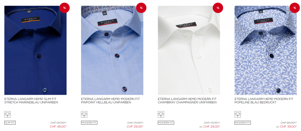 Bei Eterna gibt’s gerade verschiedene Hemden für 29 Franken. Zuzüglich CHF 4.90 Verpackungspauschale pro Bestellung. Bei einigen Hemden sind nicht mehr alle Grössen verfügbar.