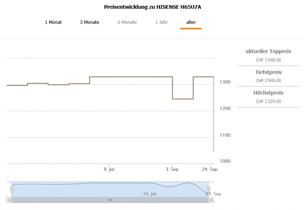 Gemäss toppreise gab es den TV bislang nie günstiger als für 1244.75 CHF, der zweitbeste Preis liegt aktuell bei 1328.90 CHF.