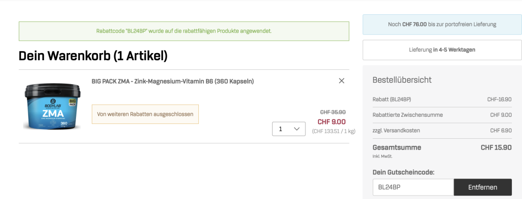 z.B. 360 Kapseln ZMA Zink-Magnesium-Vitamin B6 für CHF 15.90 inkl. Porto statt 32.80. Das entspricht. ca. 13 Rp. pro Tagesbedarf und reicht für 120 Tage.