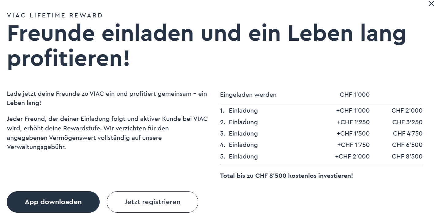 - Gerade für Sparfüchse ist VIAC super: Dank dem Freunde werben Freunde Programm kann der kostenlos verwaltete Anteil um nochmals CHF 7’500.- erhöht werden (also mit den bereits ergatterten CHF 2’000.- kommst du auf bis zu CHF 9’500.- bei 5 erfolgreichen Einladungen).