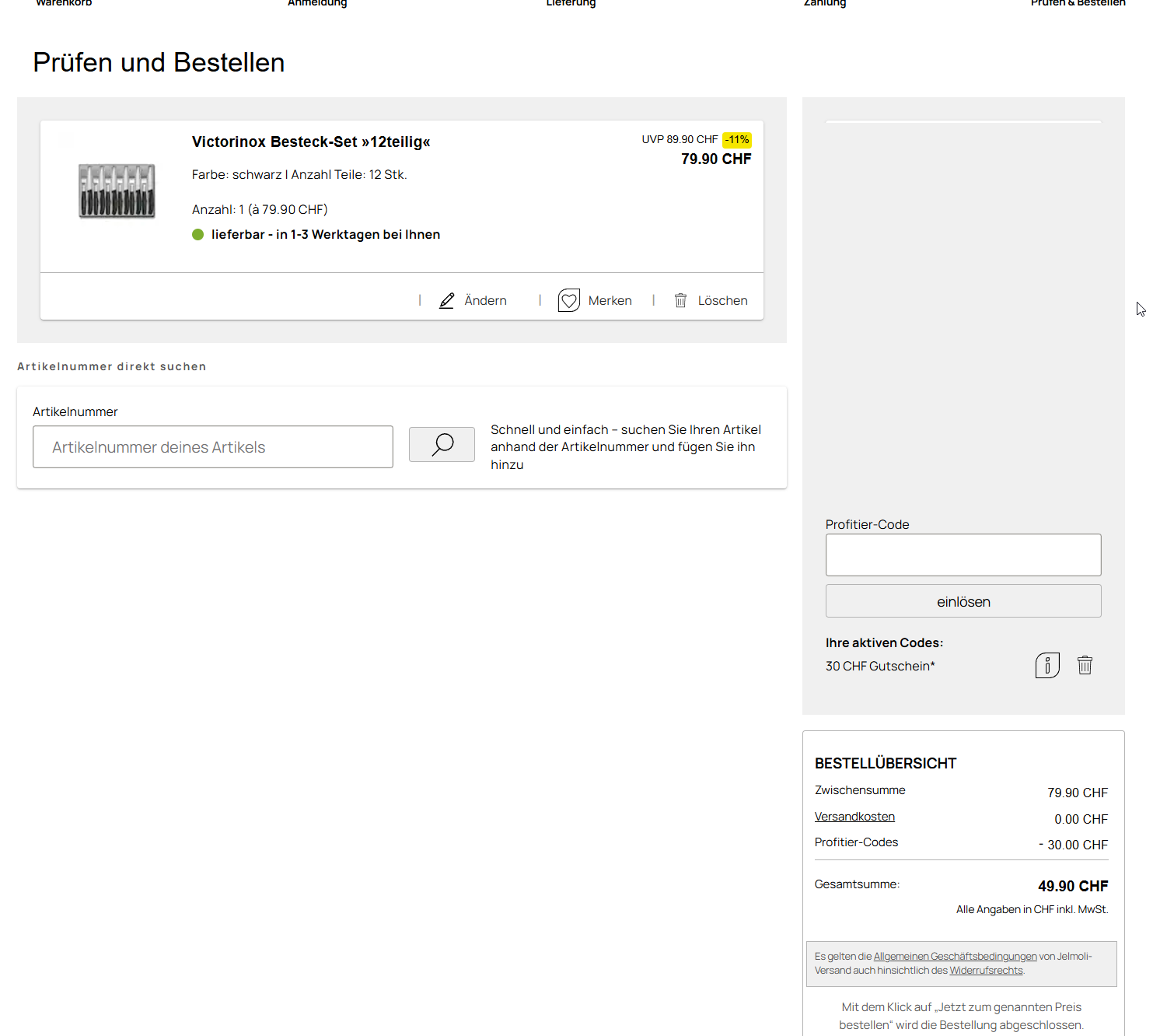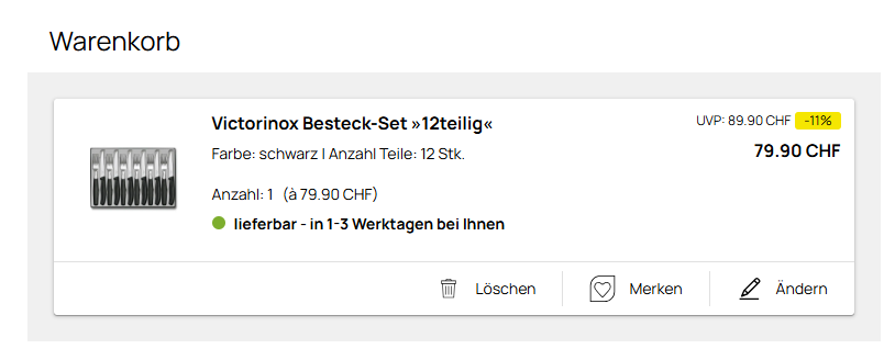 Aktuell gibt’s bei Jelmoli ein tolles Angebot. Ihr findet nämlich das Victorinox Besteck-Set Swiss Classic 12-teilig nur noch heute zum reduzierten Preis von 49.90 Franken. Damit ihr auf diesen Preis kommt, müsst ihr einfach den Artikel in den Warenkorb legen – dort werden die 30.– Franken automatisch abgezogen. Wird dann anschliessend an der Kasse angezeigt.