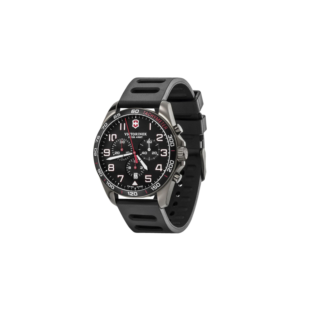Victorinox Armbanduhr FieldForce . Grosse Zeiger und Ziffern mit Super-LumiNova® (Leuchtkraft) für mühelose Lesbarkeit bei Tag und bei Nacht. Kratzfestes, dreifach beschichtetes und nicht-reflektierendes Saphirkristallglas. Mit Chronographenfunktionen und Tachymeter-Anzeige, hergestellt in der Schweiz. Schwarzes Zifferblatt mit 42 mm Durchmesser. Sportliche, farbige Uhr für jeden Anlass.