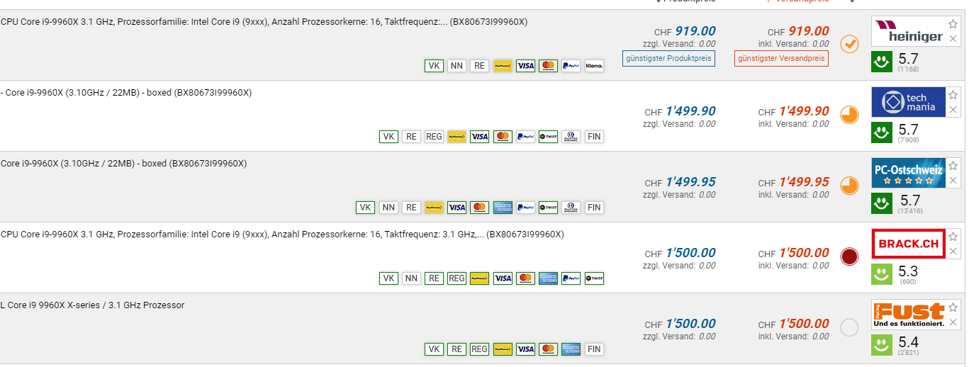 Der Core i9-9960X „Skylake-X“, 16x 3.1GHz gibt es bei Heiniger für den Bestpreis von CHF 919.-. Der zweitbeste Preis beträgt CHF 1499.95.