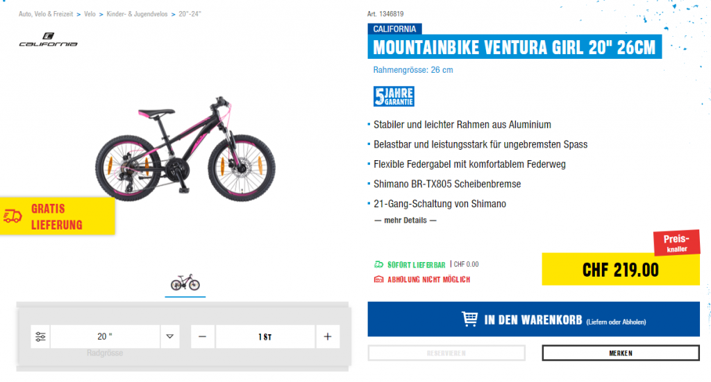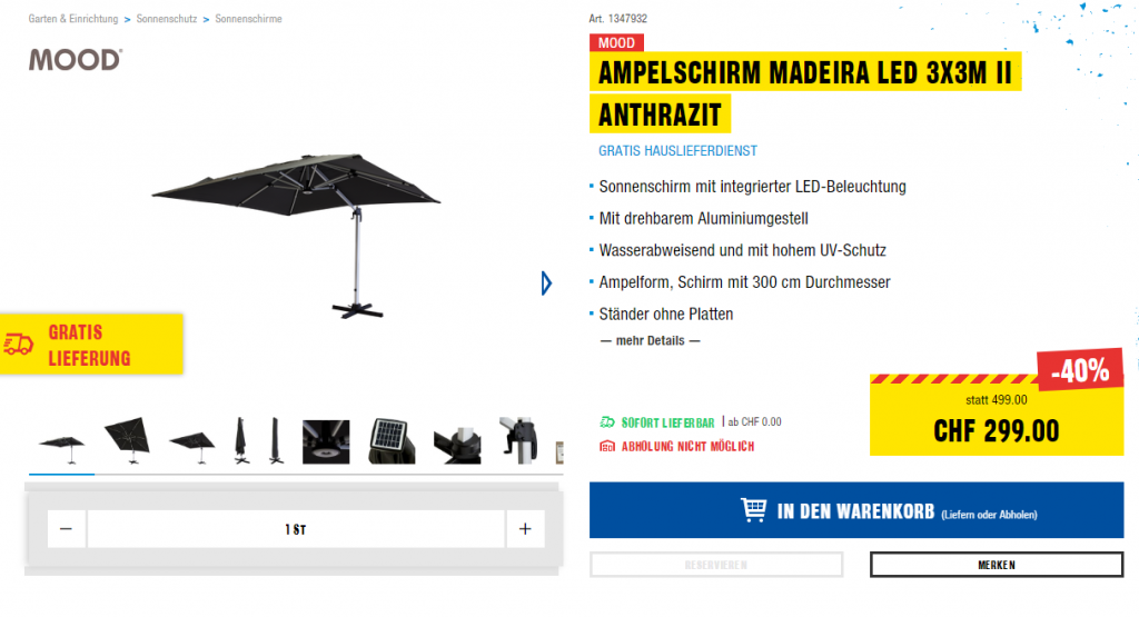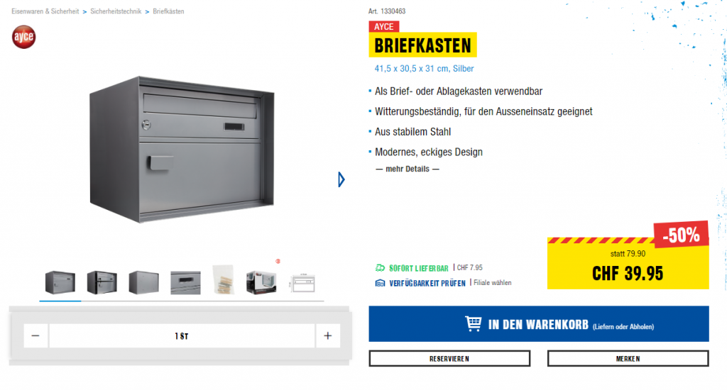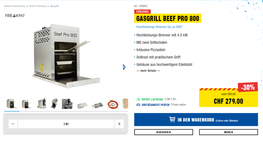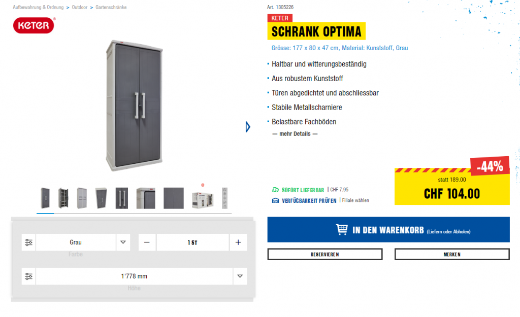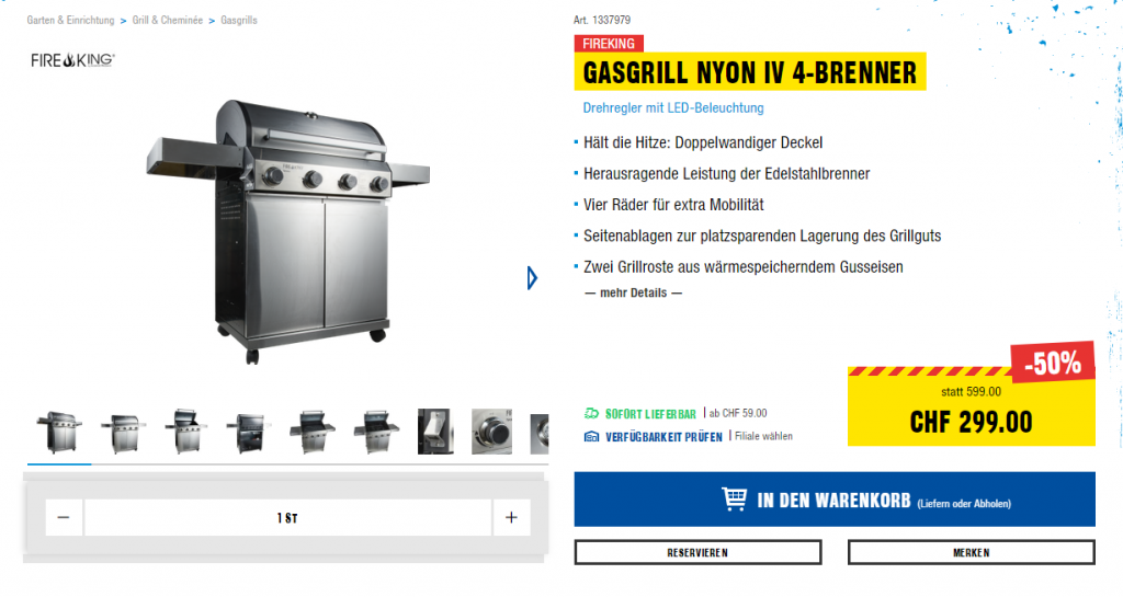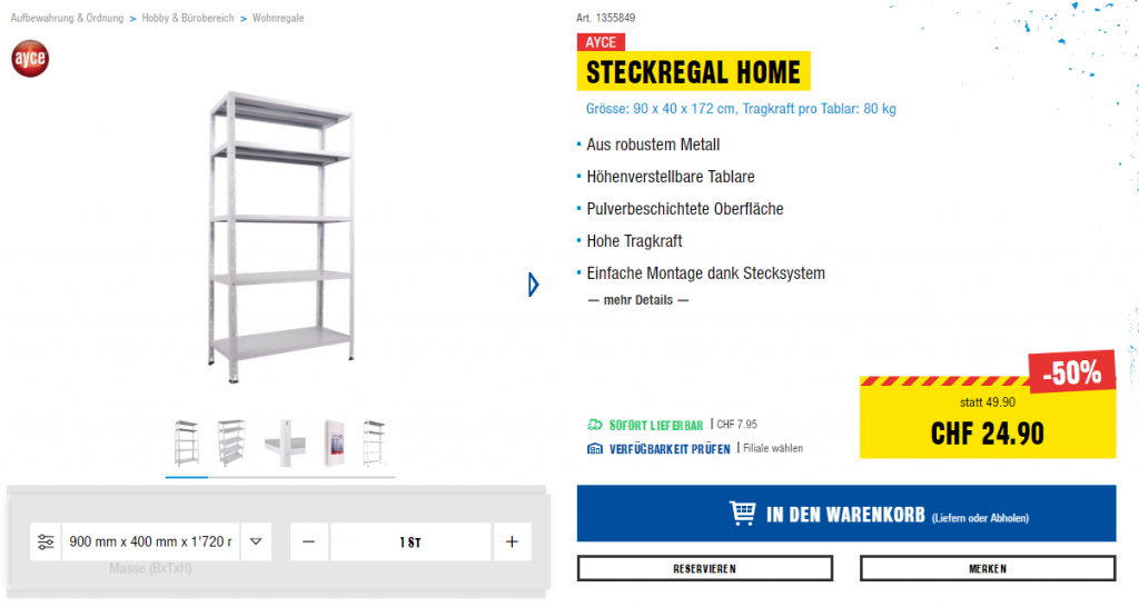 Achtet euch auf die Versandkosten. Einige Artikel (wie z.B. Mountainbike) haben Gratisversand, die meisten kosten CHF 7.95 (auch der Schrank), aber bei anderen Artikeln lohnt sich definitiv die Abholung im Laden (z.B. der Grill).