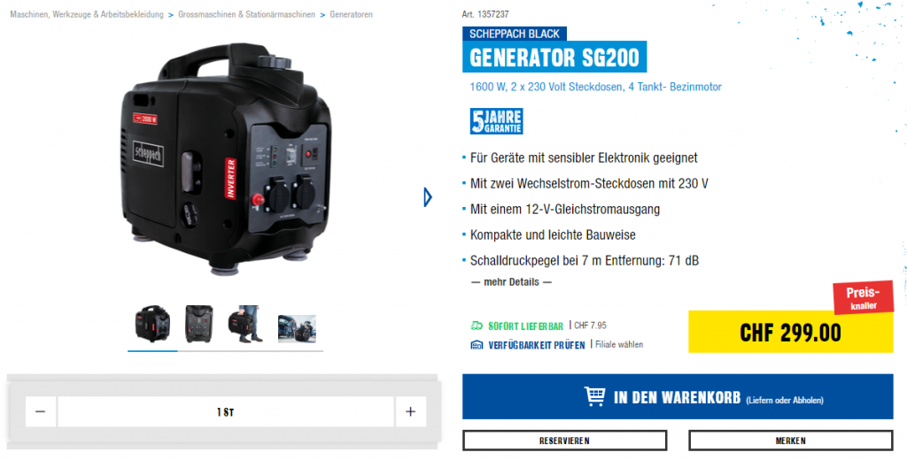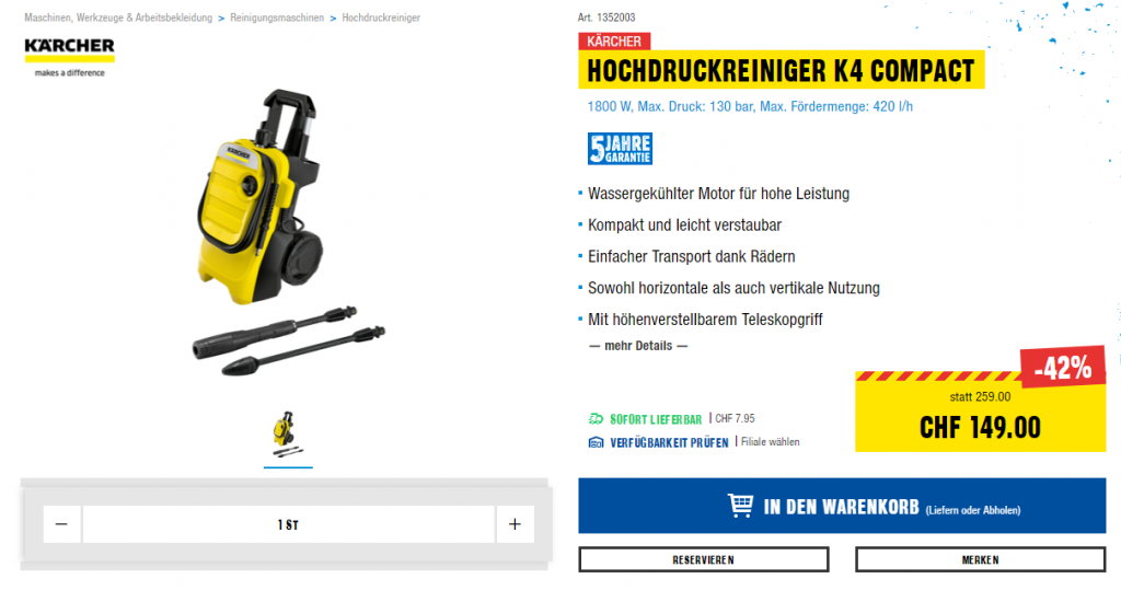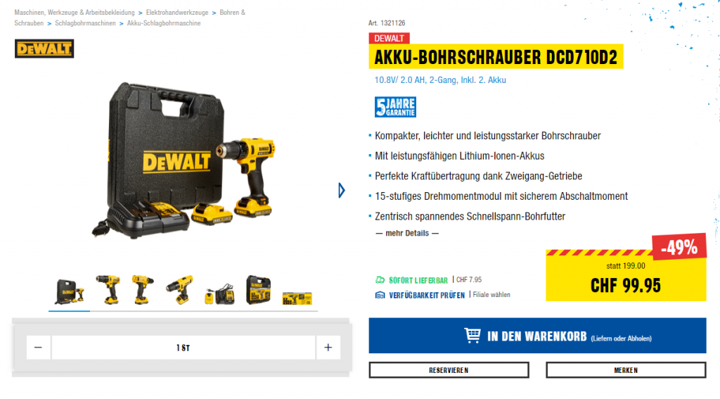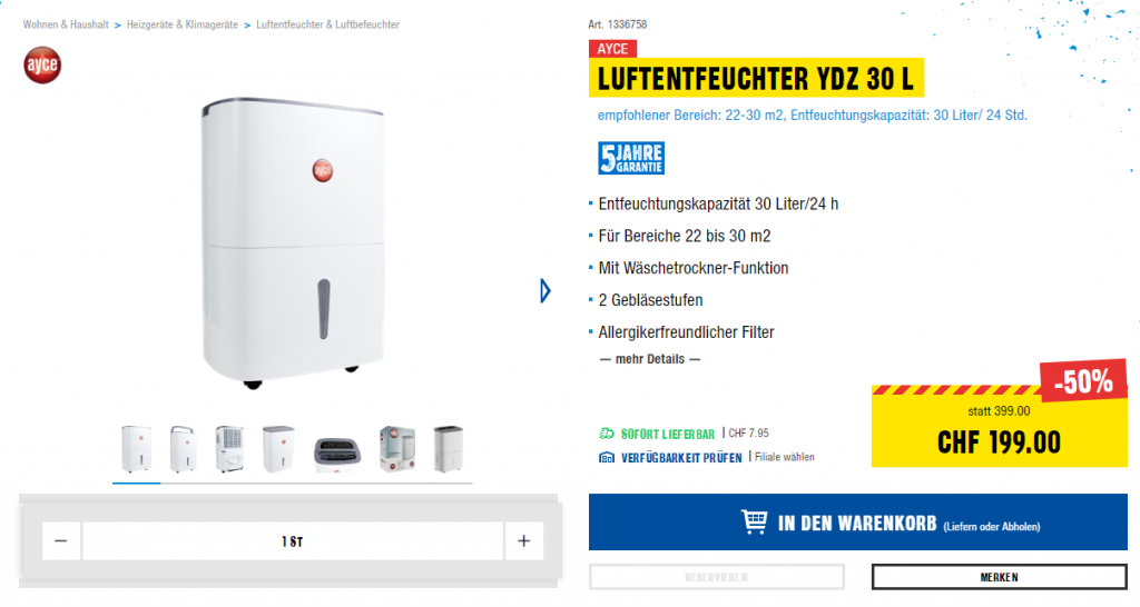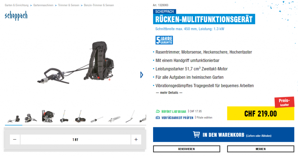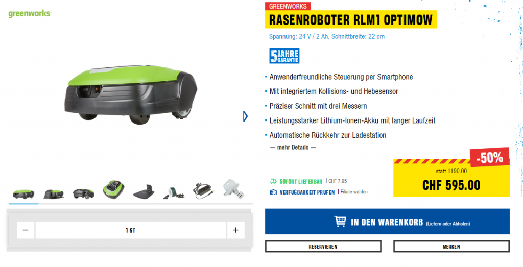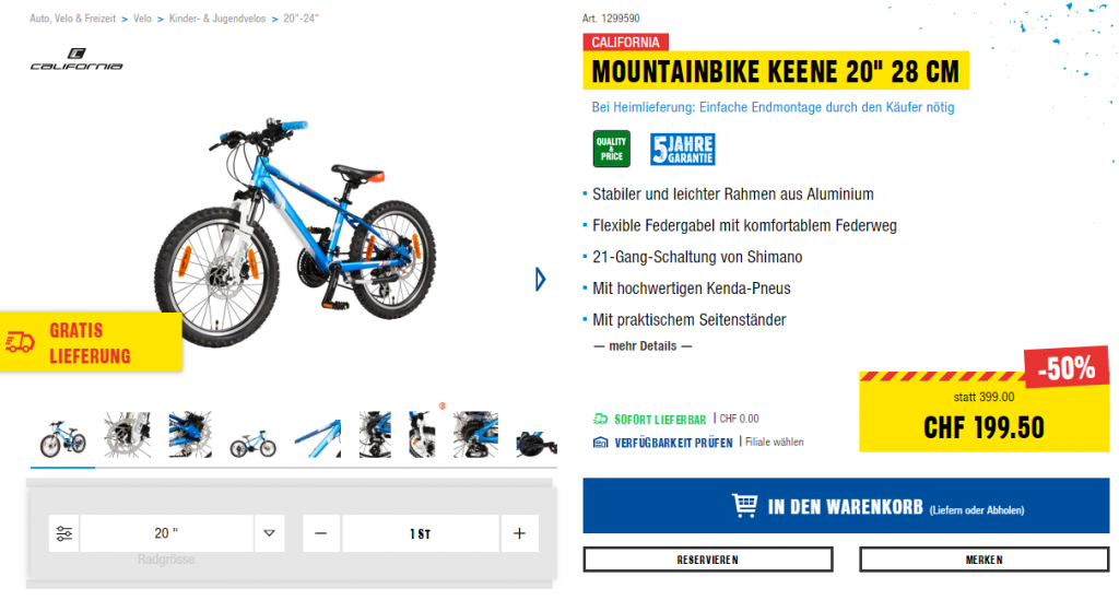 Achtet euch auf die Versandkosten. Einige Artikel (wie z.B. Mountainbike) haben Gratisversand, die meisten kosten CHF 7.95 (auch der Schrank), aber bei anderen Artikeln lohnt sich definitiv die Abholung im Laden (z.B. der Grill).