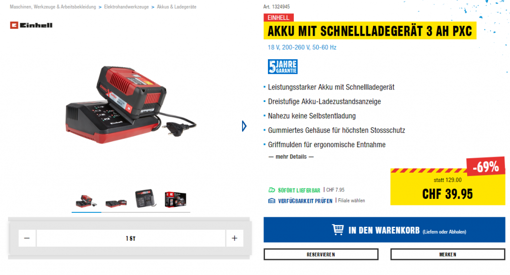 Falls jemand Bekannte in Deutschland hat: dort ist bei Obi das Einhell Starterset gerade mal wieder im Angebot. Wenn man ein passendes Gerät kauft (welche genau hängt wohl vom Markt ab), bekommt man das Set für 14,99€ dazu. Die Garantieverlängerung für die Geräte funktioniert problemlos, nur Akkus kann man (generell?) nicht verlängern in CH.