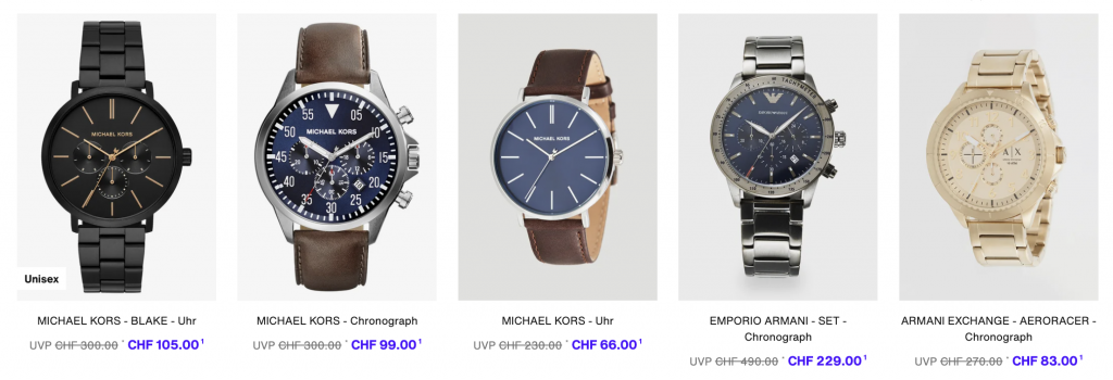 So erhält ihr zum Beispiel diese Armani Exchange Chronograph „Giacomo“ Uhr für CHF 73.- + CHF 9.90 Versand. Der zweitbeste Preis liegt für diese Uhr bei CHF 153.