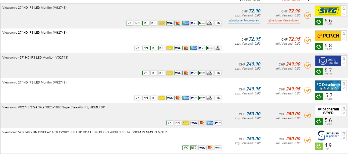 Bei Steg gibt es momentan den VIEWSONIC VG2748 Monitor für den neuen Bestpreis von CHF 72.90. Das gleiche Angebot gibt es im Schwestern-Shop PCP. Der vorherige Bestpreis war CHF 230.75. Der zweitbeste Preis beträgt CHF 249.90.