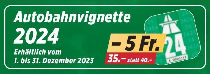 Bei Denner gibt’s wie jedes Jahr ebenfalls eine Autobahnvignetten-Aktion! Leider fällt hier der Rabatt nicht so grosszügig aus wie bei Aldi und Lidl, denn man erhält die Vignette „nur“ für 35 Franken anstatt 40 Franken - ab einem Einkauf von 100 Franken. Dennoch könnte sich dies für einige Denner-Fans lohnen, denn einige Produkte wie z.B. Lindt Pralinen etc. findet man unter Umständen nur dort (natürlich auch bei Coop, aber dort ohne Vignettenaktion).