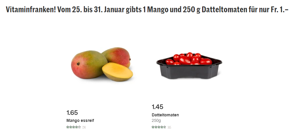 Bei Migros gibt’s in dieser Woche die nächste Vitaminfranken-Aktion! So könnt ihr jetzt Mangos oder Datteltomaten für je 1 Franken abstauben. Das Angebot gilt noch bis zum 31.1.