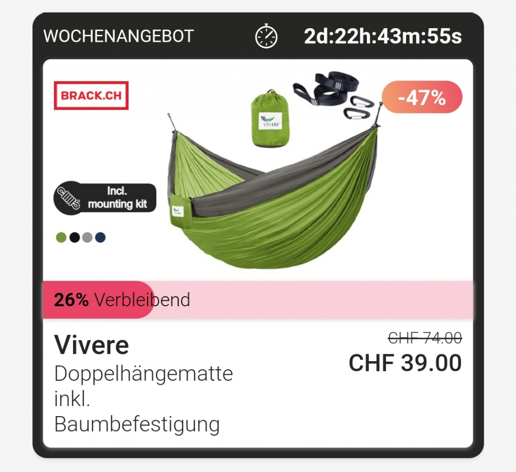 In der Twint App gibt es die Doppelhängematte von Vivere zum super Preis mit 47% Rabatt (Achtung, es ist noch das Baumset inklusaive!) für 39.- statt 74. -CHF.