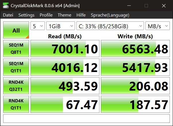 Jetzt sollte sie mit CrystalDiskMark auch die volle Geschwindigkeit anzeigen. 👍