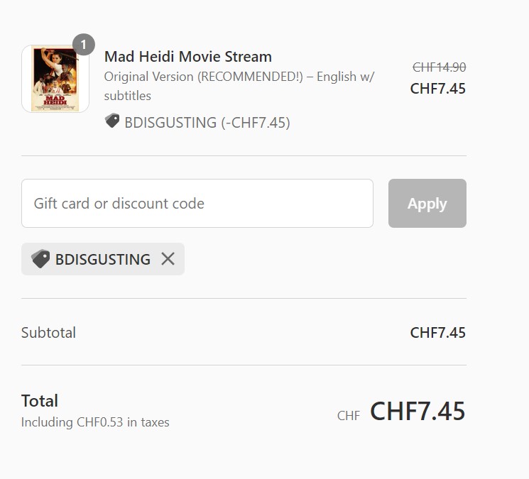 Horror-Website „Bloody-Disgusting“ hat einen 50% Rabatt-Code verbreitet. Damit zahlt man aktuell für den Film-Stream 7.45 CHF!