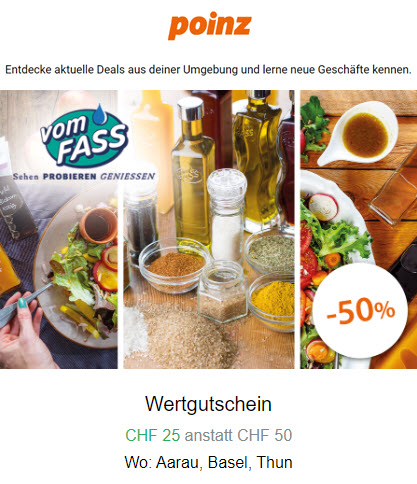 In der Poinz App kann man momentan für „vom Fass“ einen CHF 50.- Wertgutschein mit 50% Rabatt für CHF 25.- kaufen. Einlösbar ist der Gutschein in den lokalen „vom Fass“-Shops in Aarau, Basel oder Thun. Die haben dort wirklich viele leckeren Sachen (v.a. Essig und Öle in zig Varianten und Geschmacksrichtungen). Der Gutschein ist bis zum 30.4.2020 einlösbar.