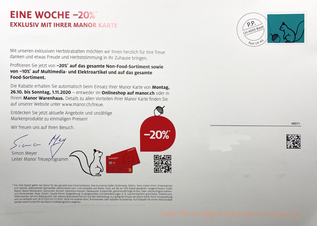 Ab Montag dem 26. Oktober bis zum Sonntag 1. November gibt es bei Manor 20% auf das gesamte Non-Food Sortiment sowie 10% auf Multimedia- und Elektronikartikel und das gesamte Food-Sortiment. Diese Aktion funktioniert nur mit einer Manor Karte (diese ist jedoch gratis).