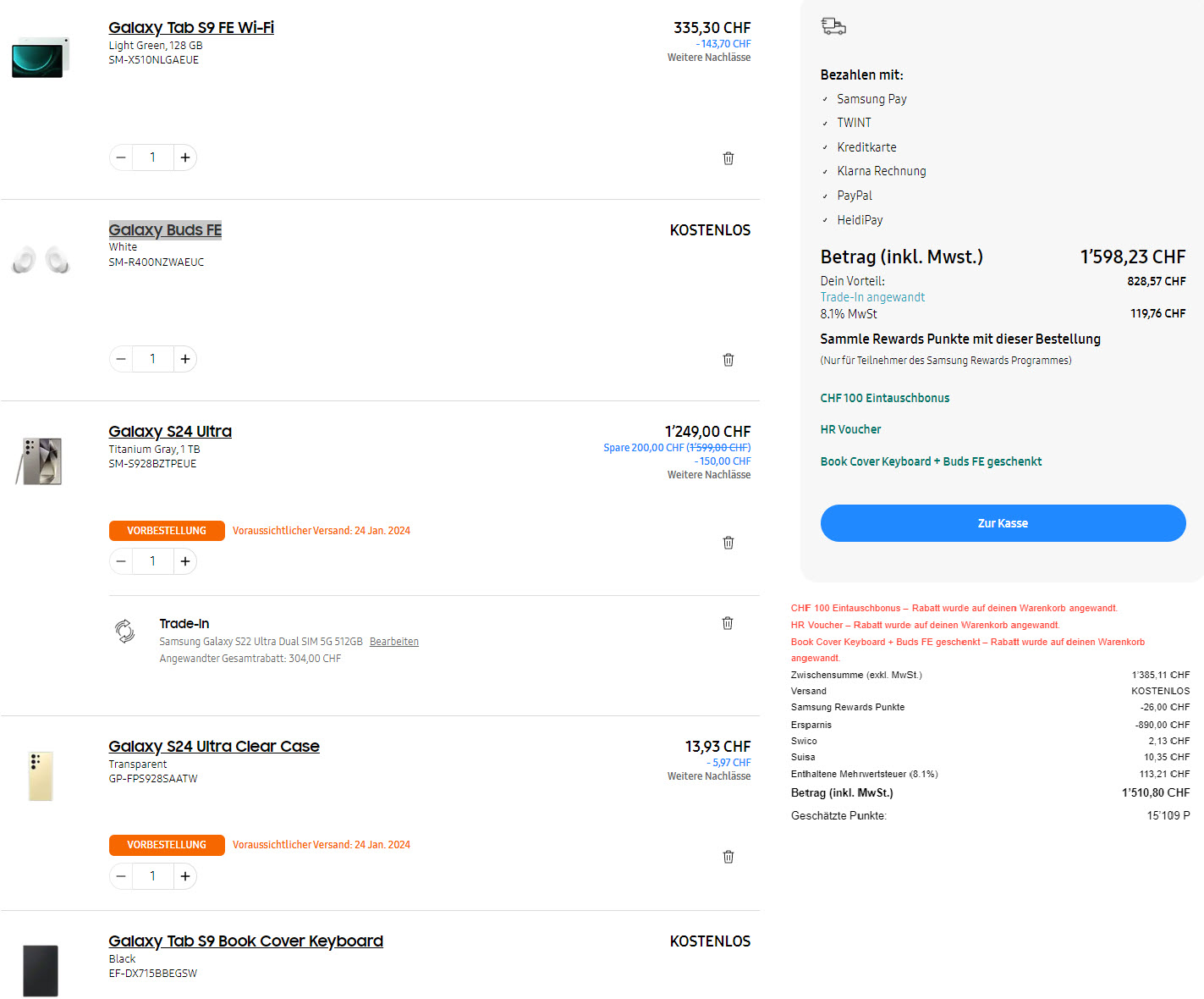 Wenn man das Flagship S24 Ultra mit 1TB bestellt, bezahlt mein bei Samsung nur CHF 1399.00, bei Digitec und Co. sind es CHF 1499.00, auch die 512GB Version ist bei Samsung günstiger. Interessant wird es, wenn noch z.B. noch das Galaxy Tab S9 FE zum Warenkorb hinzufügt. Darauf bekommt man wie anderes Zubehör zusätzlich 30% Rabatt und in der laufenden Aktion noch die Galaxy Buds FE und das Galaxy Tab S9 Book Cover Keyboard gratis dazu. Ich habe noch die einfach Silikon Hülle dazu bestellt für noch CHF 15. Zusätzlich Trade-in Rabatt über CHF 100 (kann ich immer noch ablehnen). Dazu noch Rewards Punkte über CHF 26 eingelöst und natürlich die 5% Rabatt bei Bezahlung mit Samsung Pay (TWINT sollte auch mit 5% Rabatt gehen, aber ohne Rewards Punkte). Total habe ich bei dieser Bestellung noch CHF 1510.80 bezahlt (siehe Screenshot). Dazu wieder neue Rewards Punkte, die ich mal für einen Original Samsung Charger oder so einlösen kann. Der gleiche Warenkorb kostet bei Digitec aktuell 2225.90 und damit ca. CHF 700 mehr. Man bekommt also sozusagen das gute Mittelklasse Tablet inkl. Samsung Pen, Keyboard Book Cover und Galaxy Buds geschenkt... Die zusätzlich 30% auf den Rest des Warenkorbs lohnen sich wohl noch mehr, wenn man mit einem high-end S9 oder S9+ liebäugelt.