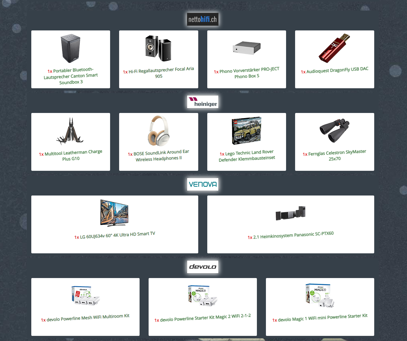 Bei toppreise.ch gibt es ab dem 1 Dezember bis am 24 Dezember 2021 täglich tolle Preise zu gewinnen. Mitmachen lohnt sich 🙂 Das ist nur ein kleiner Ausschnitt was es alles zu Gewinnen gibt
