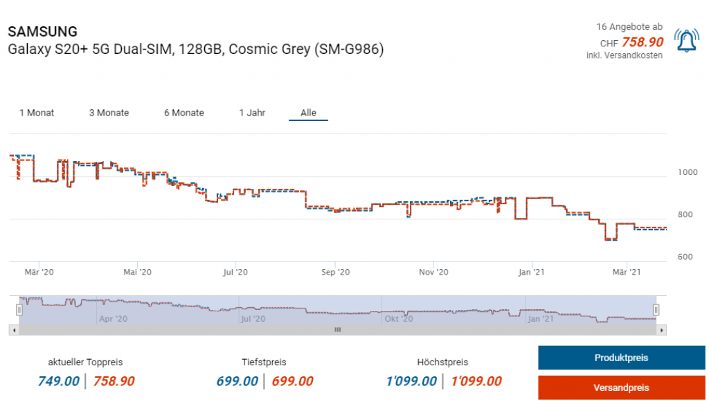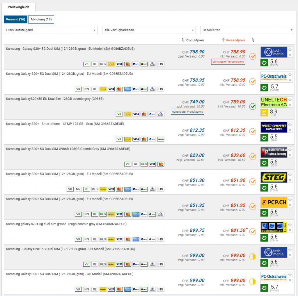 Bei amazon.es gibts derzeit das letztjährige Topmodell Samsung Galaxy S20+ 5G zum Aktionspreis von 598 Franken. Ausserdem gibts einen 100€ Gutschein, wenn ihr das Angebot per App oder Mobilbrowser wahrnehmt. Beachtet allerdings, dass noch kein Lieferdatum angegeben ist und ihr somit mit mind. 2 Wochen rechnen solltet.