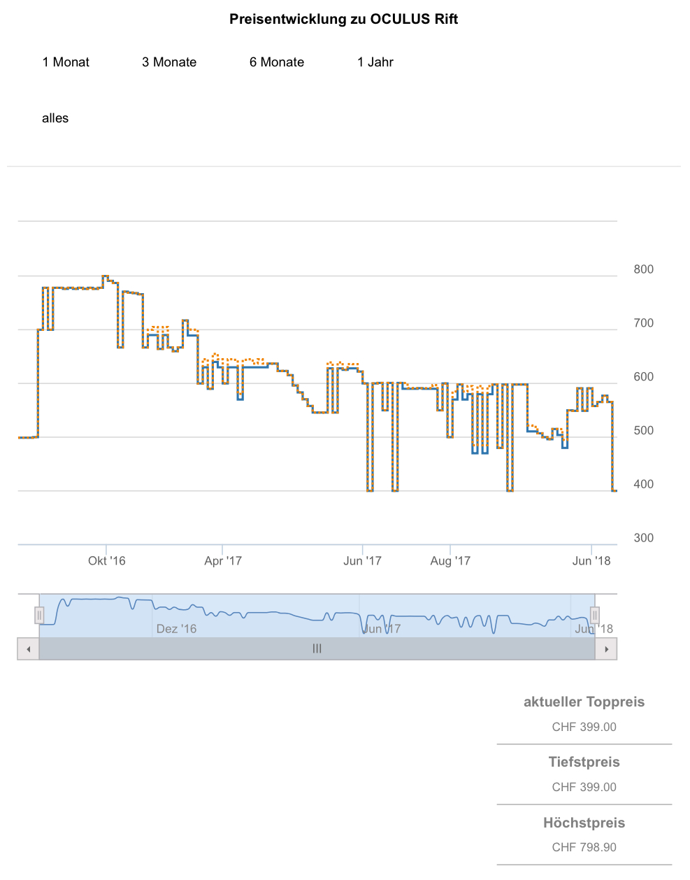 Aktuell könnt ihr bei melectronics die VR-Brille Oculus Rift für 349.10 CHF bekommen. Günstiger als für 399.- CHF gab es die Brille bislang noch nie, zweitbester Preis aktuell bei 564.50 CHF.