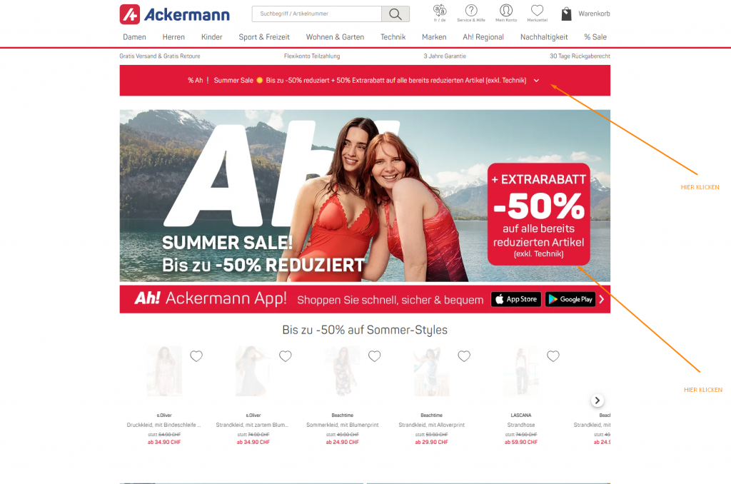 Bei Ackermann profitiert ihr derzeit von 50% Rabatt auf bereits reduzierte Artikel. Einfach auf den Vorteilsbanner klicken.