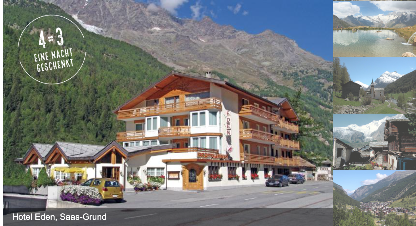 So übernachten zwei Personen für vier Nächte (Di-Sa) im 3-Sterne Hotel Eden in Saas-Grund im schönen Wallis für insgesamt CHF 388. Dazu kommt eine Kurtaxe von CHF 7.- pro Person und Nacht, welche im Hotel bezahlt werden muss. Das Hotel hat hervorragende Bewertungen bei Google.
