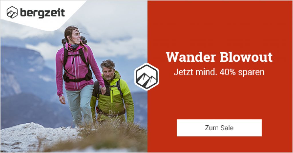 Bei Bergzeit gibt es aktuell den Wander Blowout Sale mit mindestens 40% Rabatt auf Bekleidung, Schuhe, Accessoires und Ausrüstung.
