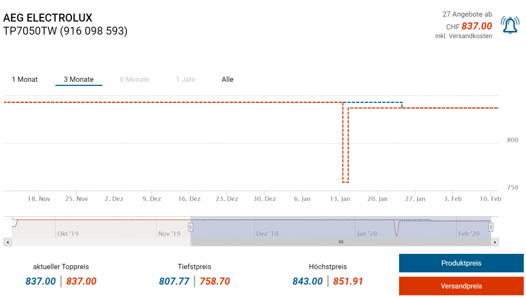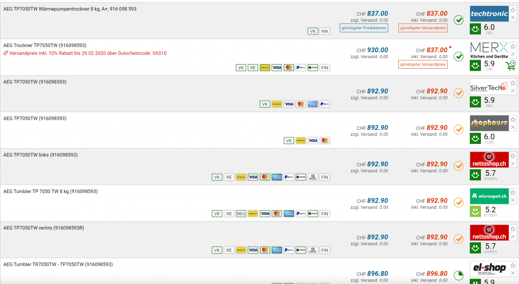 Wäschetrockner: Zweitbester Preis CHF 837.- // Bestpreis: CHF 758.70