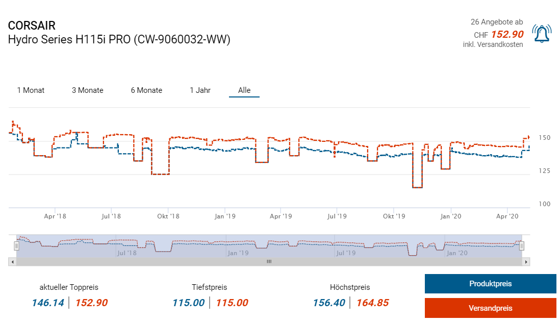 Bei amazon.fr gibts derzeit die Wasserkühlung mit RGB-Licht Corsair Hydro Series H115i Pro RGB in Aktion. So erreicht ihr inkl. Lieferung den Bestpreis von 114 Franken (also fast dem gleichen Bestpreis wie vor dem Black Friday 2019.