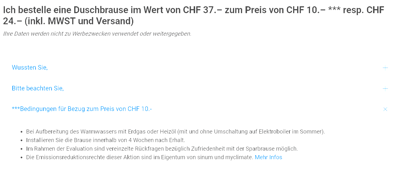Die Aktion ist an folgende Bedingungen geknüpft, damit ihr die Duschbrause für CHF 10.- erhält. Ansonsten ist der Preis CHF 24.-.