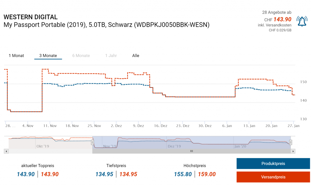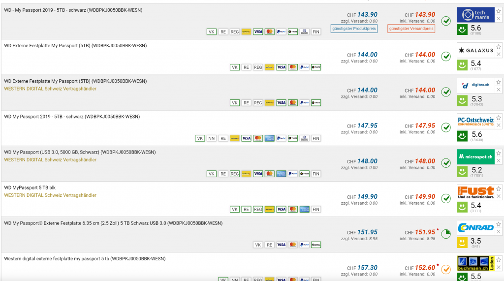 Bei Amazon UK erhält man die WD 5TB My Passport Portable für umgerechnet CHF 87 Franken inklusive Lieferung in die Schweiz und Verzollung. In der Schweiz bezahlt man ab CHF 143.90 Bestpreis war bei CHF 134.-