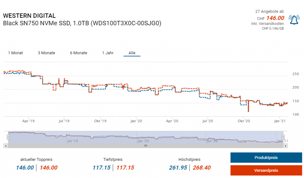 Bei Amazon gibts derzeit die flotte Gaming-SSD WD_Black SN750 mit 1TB Speicherkapazität und bis zu knapp 3.5 Gbps Übertragungsrate zum Aktionspreis von fast 128 Franken. Laut toppreise starten die Preise in der Schweiz bei 146 Franken.