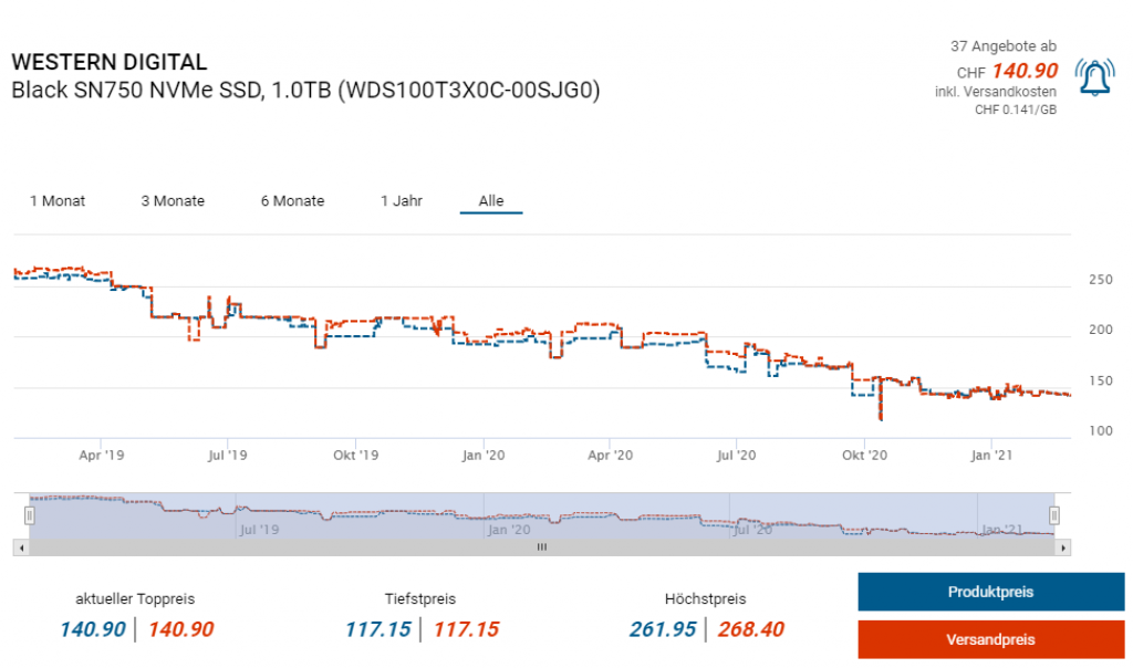 Bei Amazon gibts derzeit die leistungsstarke interne SSD WD BLACK SN750 mit 1TB Speicherkapazität zum Aktionspreis von knapp 119 Franken. Laut toppreise starten die Preise hierzulande bei 140 Franken.