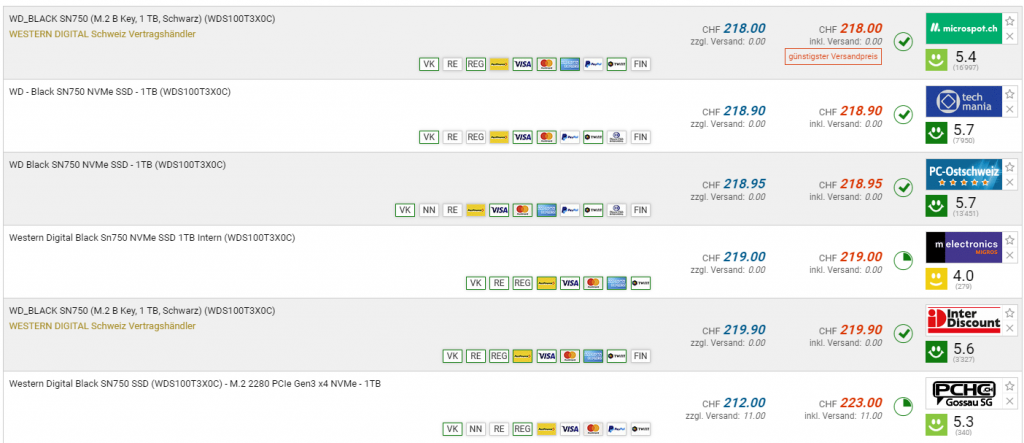Bei digitec gibt es die WD Black SN750 Gaming 2TB SSD für den neuen Bestpreis von CHF 179.-. Der vorherige Bestpreis war CHF 189.-. Der zweitbeste Preis beträgt CHF 218.- bei Microspot.