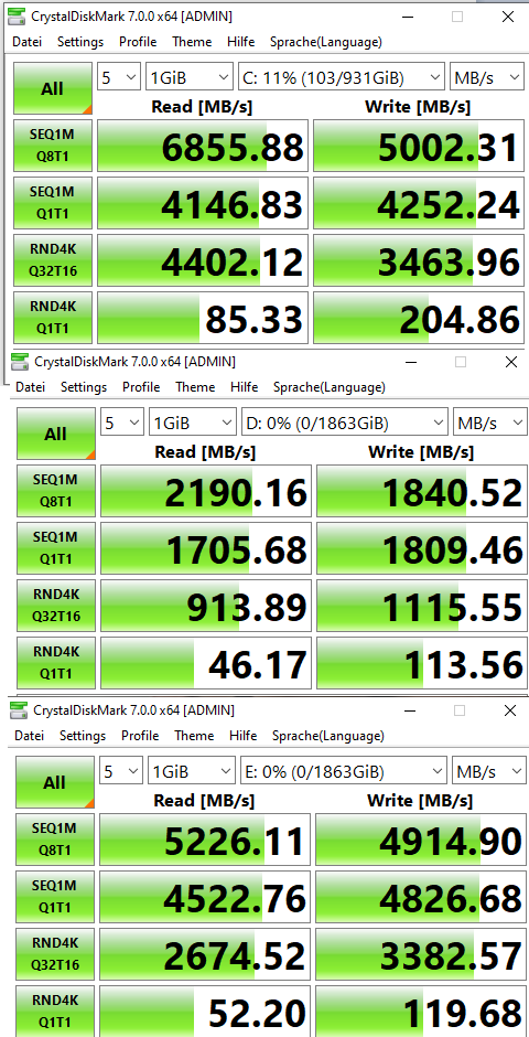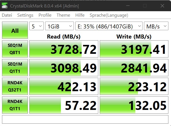 Ich habe sie bei meinem T14 Laptop "nur" an einem PCIe 3.0 angeschlossen und folgende Werte.