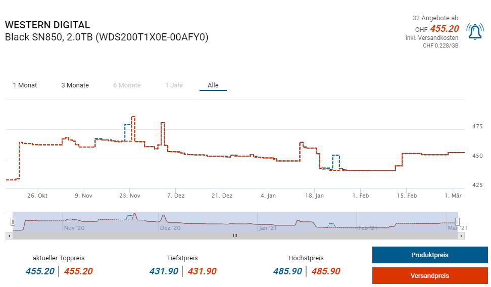 Bei Amazon Spanien gibts derzeit die Highspeed-SSD WD BLACK SN850 zum neuen Bestpreis von knapp 372 Franken. Laut toppreise soll der Vergleichspreis derzeit bei über 455 Franken liegen.
