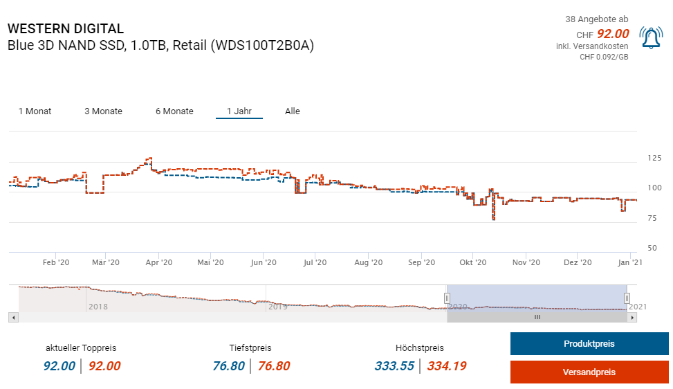 Bei Amazon gibts derzeit die interne SSD WD Blue mit 1TB Speicherkapazität zum Aktionspreis von knapp 81 Franken, laut toppreise liegt der Vergleichspreis in der Schweiz bei 92 Franken. Den Bestpreis gabs übrigens am Sinlges Day für knapp 77 Franken (laut toppreise).