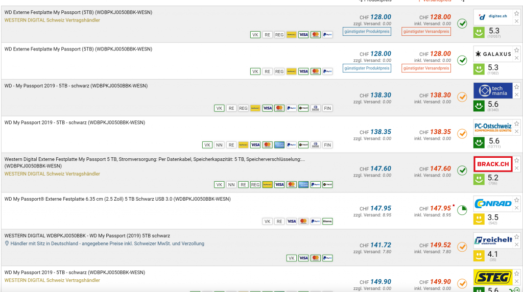 Bei Amazon gibt’s gerade die WD My Passport externe Festplatte 5 TB für umgerechnet CHF 102.25 Zweitbester Preis in der Schweiz liegt bei CHF 128.- Bestpreis bei CHF 123.-