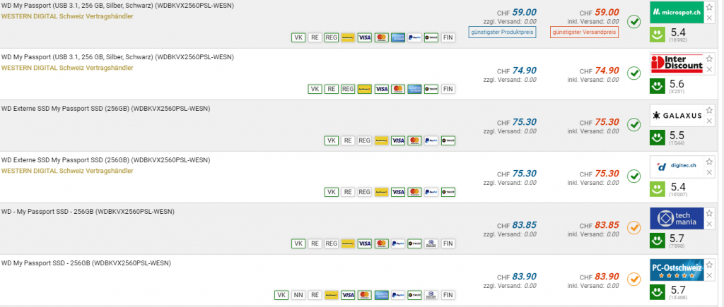 Bei Microspot gibt es die WD My Passport SSD mit 256gb für den Bestpreis von CHF 59.-. Im September war die Festplatte schon einmal für diesen Preis erhältlich. Der zweitbeste Preis beträgt CHF 74.90.