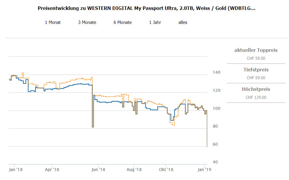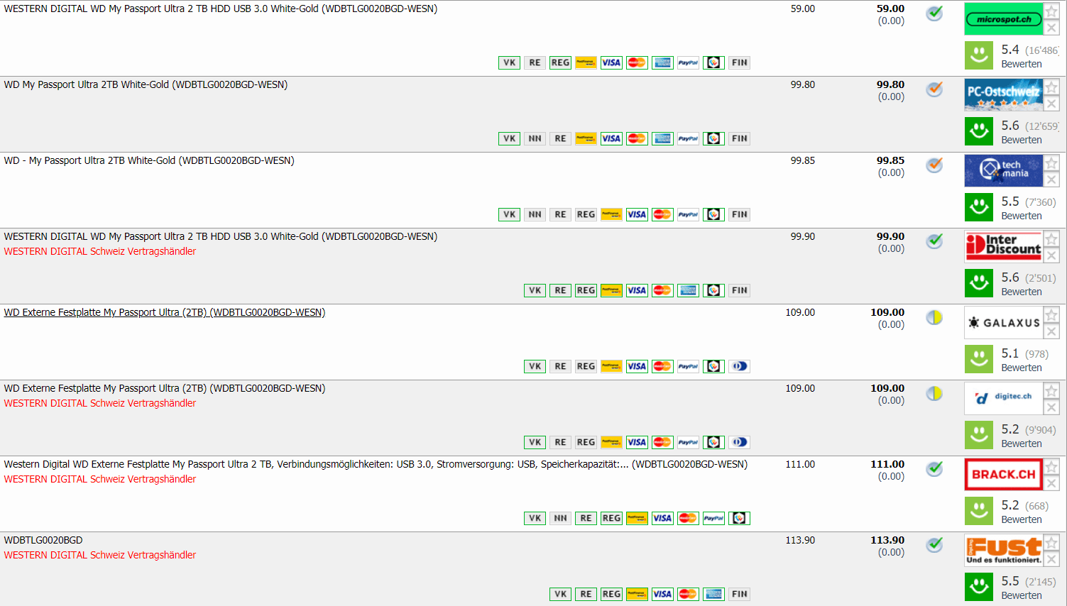 Bei microspot erhält man die WD My Passport Ultra 2 TB HDD USB 3.0 für CHF 59.- Zweitbester Preis in der Schweiz ist bei CHF 99.80 Bisheriger Bestpreis bei CHF 81.-