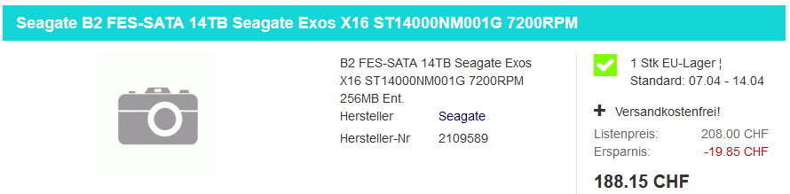 Preis kommt teilweise erst bei Klick über Vergleichsportal zustande: https://www.toppreise.ch/preisvergleich/Festplatten-HDD/SEAGATE-Exos-X16-512e-SATA-14TB-ST14000NM001G-p561889 .