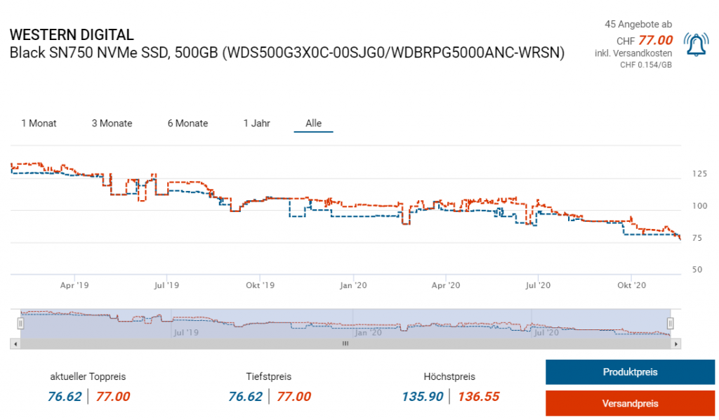Bei Amazon gibts derzeit die Gaming-SSD WD_Black SN750 mit 500GB Speicherkapazität zum Aktionspreis von knapp 59 Franken. Laut toppreise liegt der zweitgünstigste Preis derzeit bei CHF 77.- Wenn man dem Graphen glauben kann, handelt es sich zudem um einen neuen Bestpreis.