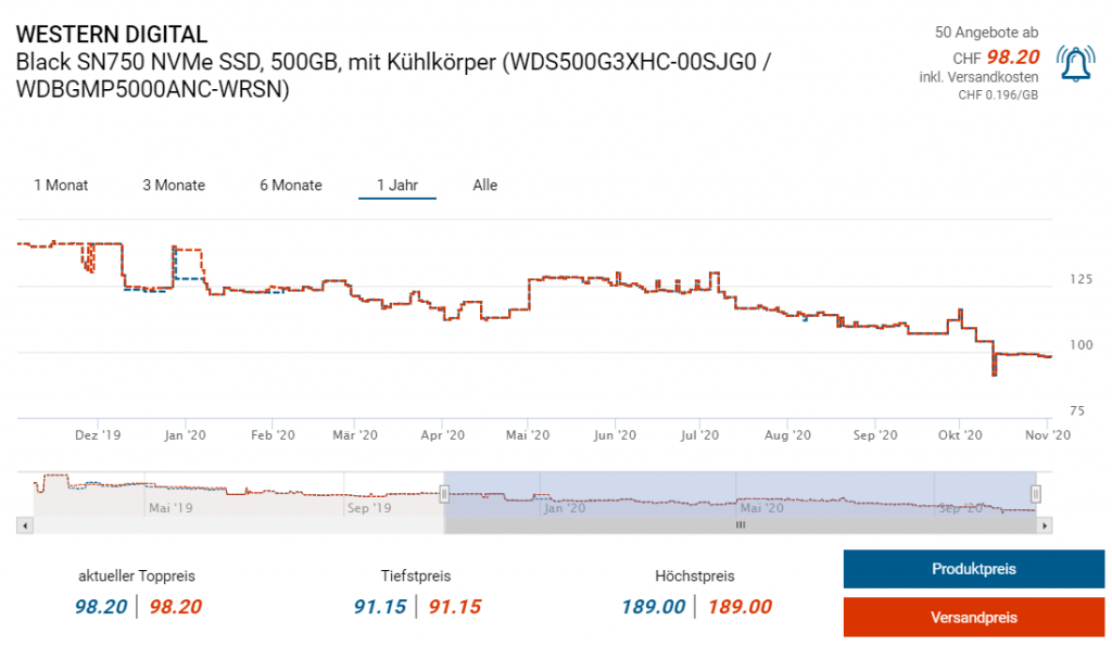 Bei Amazon gibts derzeit die High-Performance SSD SN750 mit Heatsink in der 500GB Variante zum Aktionspreis von 75 Franken. Laut toppreise bewegt sich der Vergleichspreis derzeit bei CHF 98.20.