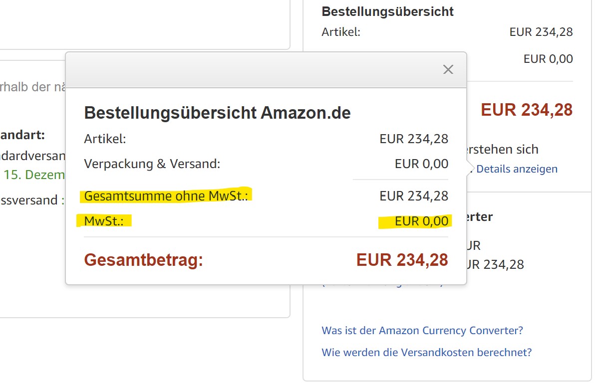 Ansonsten wäre da von Amazon eine MwSt ausgewiesen. Die fehlt hier ja offensichtlich.
