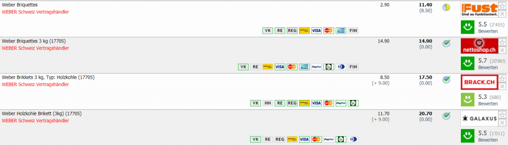Bei Fust gibt’s gerade die Weber Briketts für CHF 2.90. Zweitbester Preis beträgt CHF 8.50 Mit der Empfehlung, entweder mehrere Pack zu bestellen oder aber die Briketts abzuholen, da ansonsten CHF 8.90 für die Lieferung obendrauf kommen.